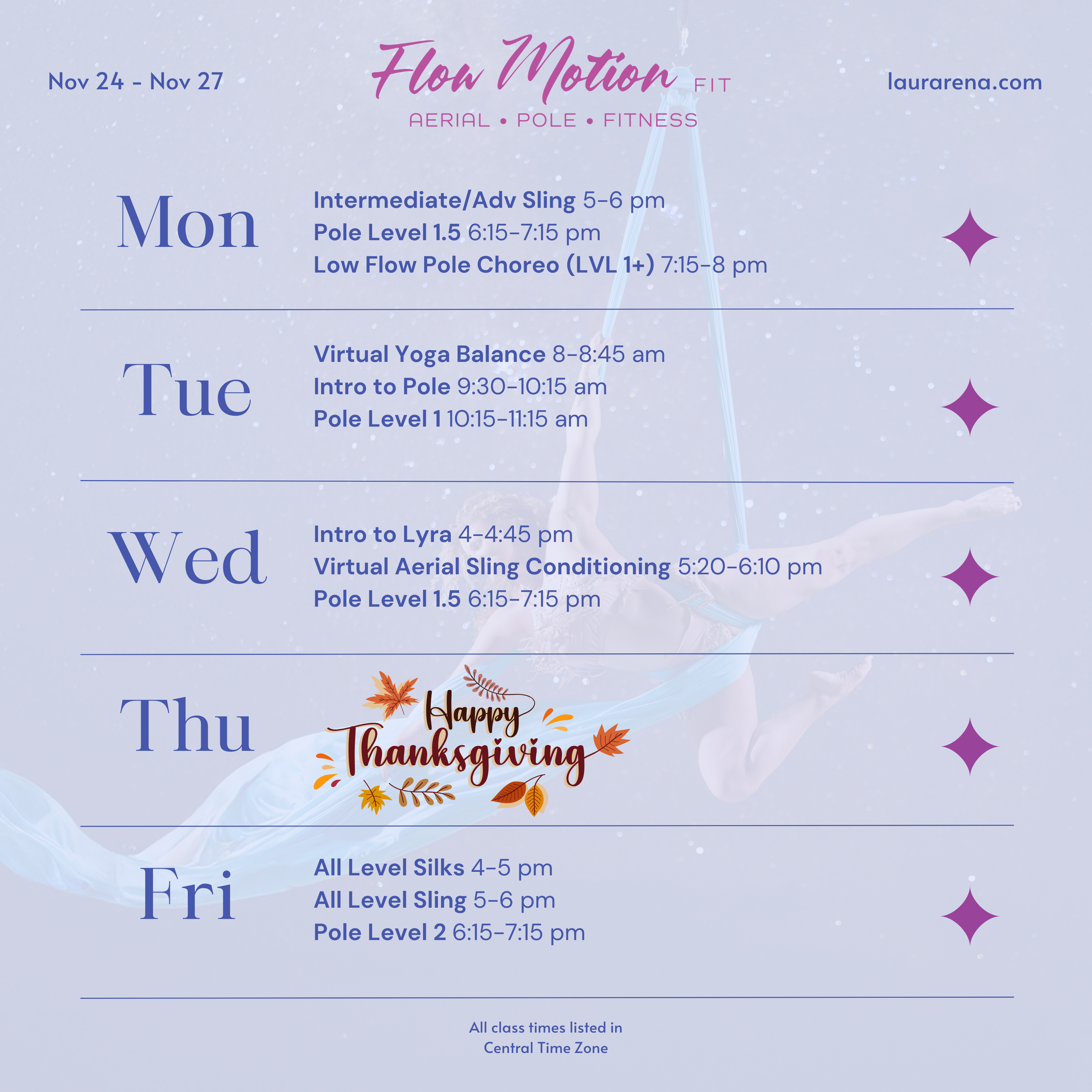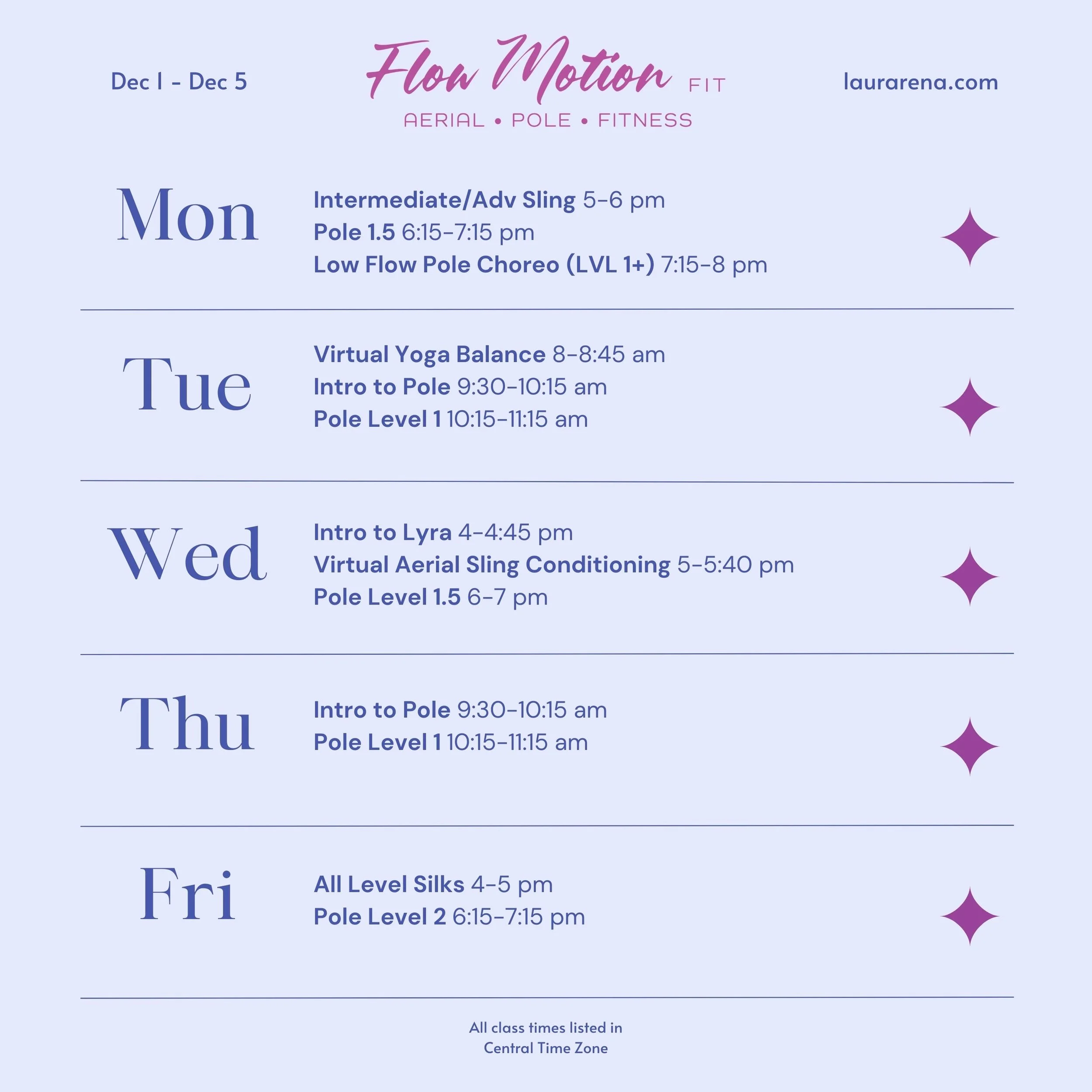 Flow Motion Fit offers small-group pole and aerial classes, in-person and online, designed to help you build strength, confidence, and flexibility at your own pace.