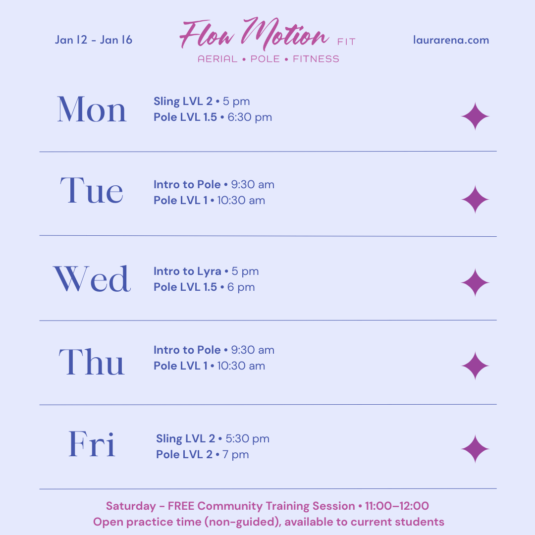 Aerial classes are held outdoors, so the schedule may shift based on weather and sunset times.
